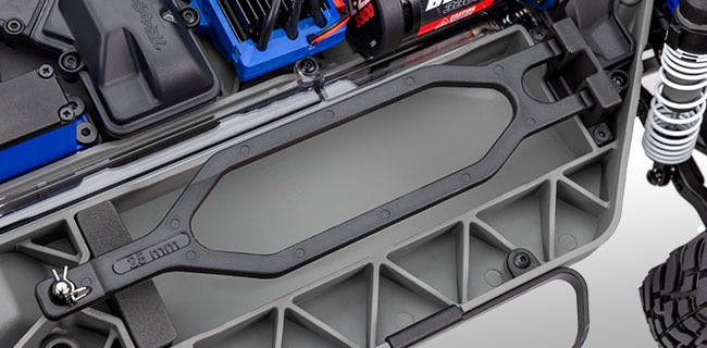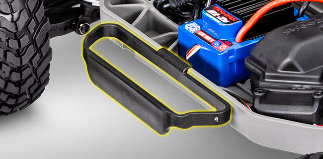 Uchwyt akumulatora Slash'a 4X4 zabezpiecza akumulatory LiPo 2S, lub NiMh 6-7S, zapewniając maksymalną wszechstronność. Opcjonalny zestaw do mocowania wysokich akumulatorów to #5827X (sprzedawany oddzielnie) umożliwia mocowanie większych akumulatorów.