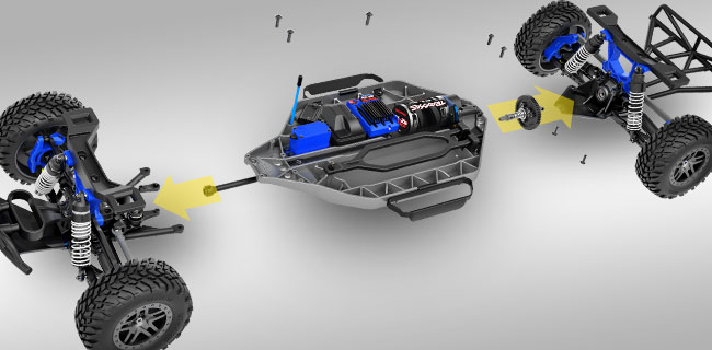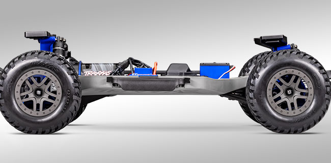 Długie podwozie Slash'a z rozstawem osi 12,75″ zwiększa stabilność przy dużych prędkościach dzięki prawie 3-calowemu prześwitowi, aby uniknąć wysokiego centrowania. Podwozie zawiera otwory spustowe i otwory do montażu opcjonalnego bezszczotkowego systemu zasilania Velineon 3s.
