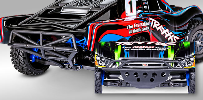 Przednie i tylne zderzaki modelu Slash'a są solidnie przymocowane do wzmocnionych przegród, aby amortyzować uderzenia. Zderzaki w stylu rurowym zapewniają solidną ochronę, a jednocześnie wyglądają jak prawdziwa ciężarówka wyścigowa.
