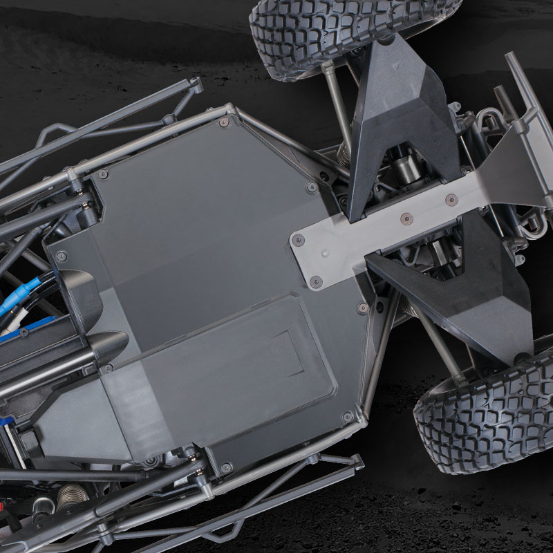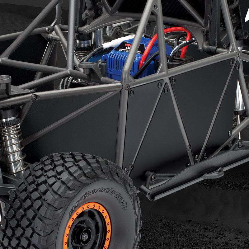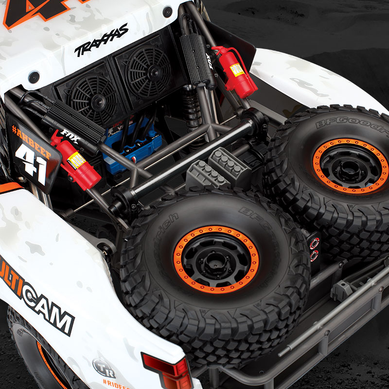 Unlimited Desert Racer został zaprojektowany w oparciu o autentyczne podwozie samochodów wyścigowych z napędem na 4 koła. 4-linkowa, solidna konstrukcja tylnej osi zapewnia ogromną amortyzację przy zachowaniu autentycznej dynamiki jazdy. Od amortyzujących pałąków wspornika do amortyzatorów 8 GTR, Traxxas dokładnie oddał prawdziwe podwozie wyścigowe zarówno pod względem formy, jak i funkcji.