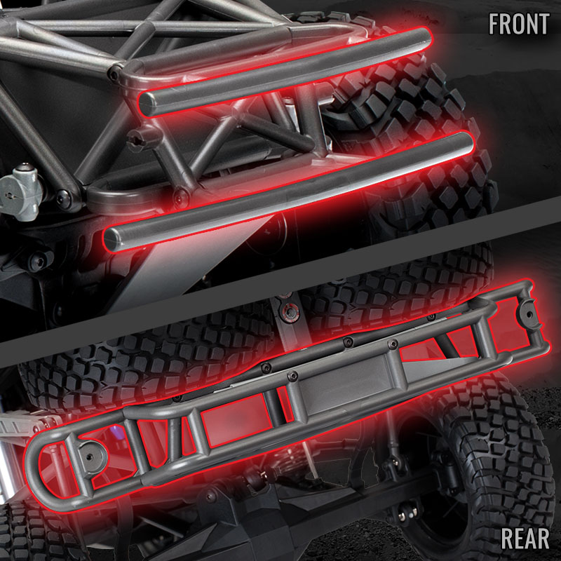 Precyzyjnie modelowana karoseria to bezpieczny i wytrzymały korpus Pro-Scale, solidnie przymocowany do ramy. Otwarta konstrukcja okna prezentuje skomplikowaną ramę podwozia i szczegóły kokpitu. Dwa rodzaje malowanmia - Fox lub RIGID doskonale prezentują się na pustyni.
