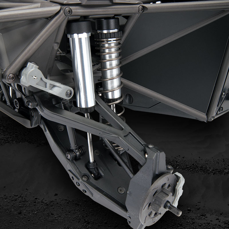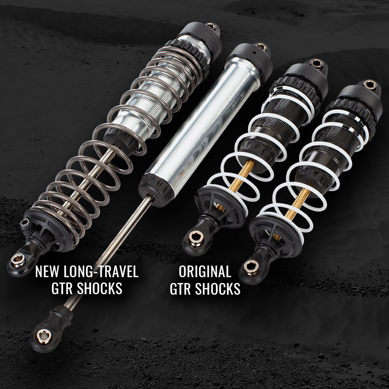 Ogromne, aluminiowe amortyzatory GTR o ekstremalnym skoku są gwintowane w celu dostosowania wysokości jezdnej na jednej wysokosprawnej sprężynie w każdym rogu. Oddzielny amortyzator zapewnia dodatkowe działanie tłumiące i podwaja pojemność oleju, aby uzyskać jak najsprawniejsze działanie.