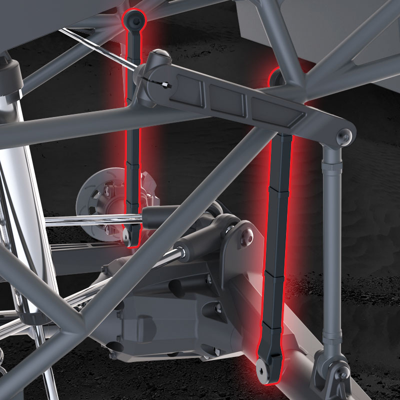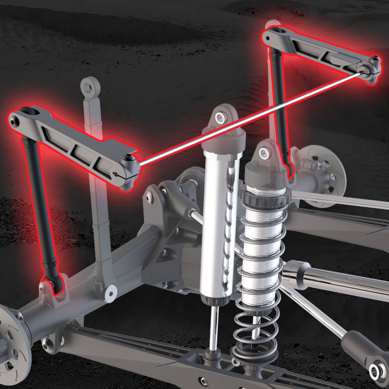 Podwójne - masywne przednie wahacze zachowują właściwą geometrę w całym zakresie ich ogromnego zakresu. Półstabilna konstrukcja w pełni wychwytuje nierówności terenu. Duże bloki sterownicze wykorzystują ponadwymiarowe łożyska, aby pomieścić stalowe osie.