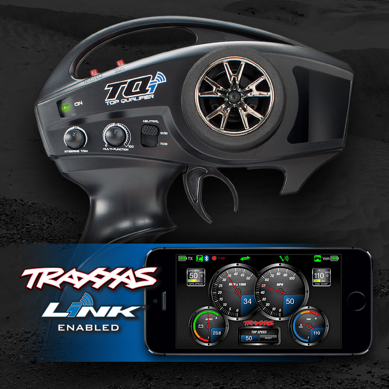 W pełni funkcjonalny system radiowy TQi 2,4GHz zapewnia najwyższą jakość, precyzję i kontrolę wymaganą do prowadzenia Desert Racer'a po pustyni . Nadajnik jest przystosowany do współpracy z systemem Traxxas Link, co pozwala na wykorzystanie wszystkich opcji regulacyjnych oraz korzystanie z informacji telemetrii w czasie rzeczywistym