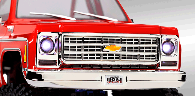 TRX-4M K10 jest wyposażony w standardowe reflektory LED w przednim grillu. Dodaj opcjonalne światła LED Pro Scale, a K10 ożyje dzięki funkcjonalnym światłom hamowania, cofania, a nawet migaczy awaryjnych (światła Pro Scale sprzedawane oddzielnie).