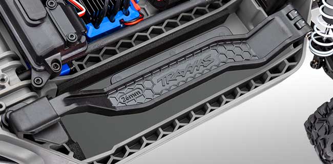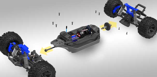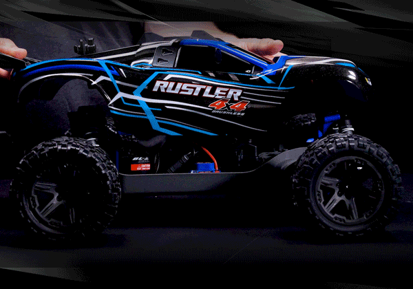 Wytrzymała karoseria Rustler'a 4X4 trzyma się mocno bez względu na to, jak trudna jest akcja. Wytrzymałe zatrzaski mocno trzymają nadwozie, ale zwalniają się w ciągu kilku sekund, aby uzyskać dostęp do podwozia. Ukryty system zatrzasków zastępuje czasochłonne i niewygodne klipsy nadwozia dużymi wzmocnionymi panelami, które są odporne na uszkodzenia.