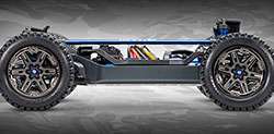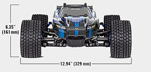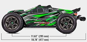 Innowacyjne, grafitowo-szare podwozie Low-CG Rustlera umieszcza ciężar nisko, zapewniając agresywne prowadzenie. Szeroki rozstaw kół i wydłużony rozstaw osi utrzymują Rustlera w zakrętach, zapewniając idealną równowagę między stabilnością i szybkimi reakcjami.