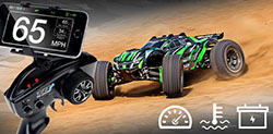 Fabrycznie zainstalowane czujniki telemetryczne zbierają i rejestrują dane telemetryczne Rustlera 4X4 Ultimate podczas jazdy. Skorzystaj z bezpłatnej aplikacji Traxxas Link, aby wyświetlać w czasie rzeczywistym dane dotyczące prędkości, obrotów, temperatury i napięcia akumulatora. Pełnokolorowy pulpit nawigacyjny aplikacji można w pełni dostosować za pomocą maksymalnie dziewięciu różnych wskaźników zegarowych lub cyfrowych.