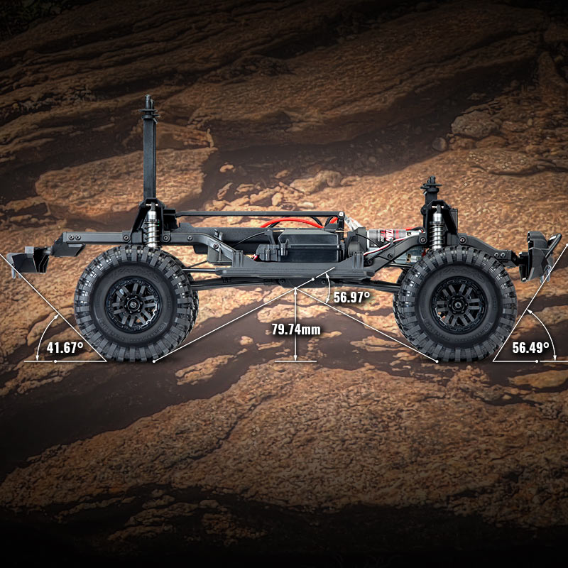 Podwozie przystosowane jest do poruszania się w bardzo trudnym terenie. Prześwit wielkości 80mm uzupełnia wszechstronne możliwości poruszania się TRX-4.