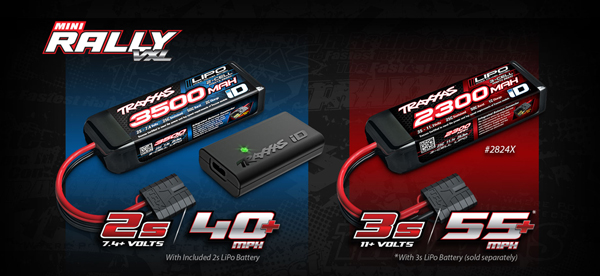 Mini Rally VXL jest wyposażony w 2-ogniwowy akumulator LiPo o pojemności 3500mAh, który zapewnia dużą moc, długi czas pracy i prędkość ponad 64km/h. Dołączona ładowarka USB-C LiPo o mocy 2A zapewnia szybkie i niezawodne ładowanie z bezpieczeństwem i prostotą Traxxas iD.