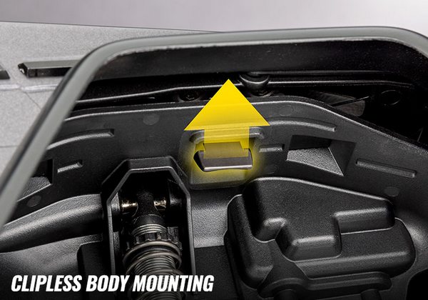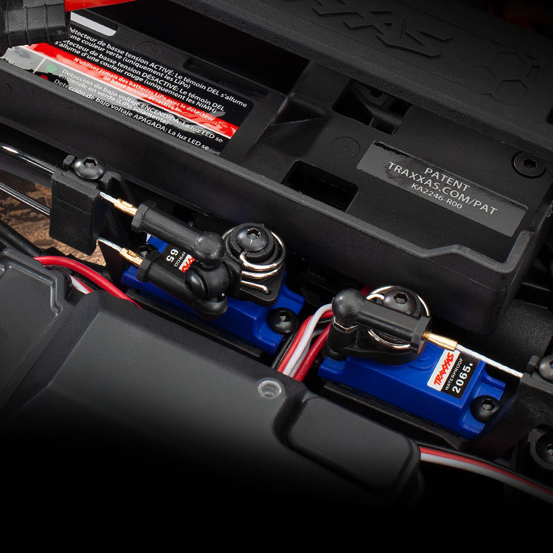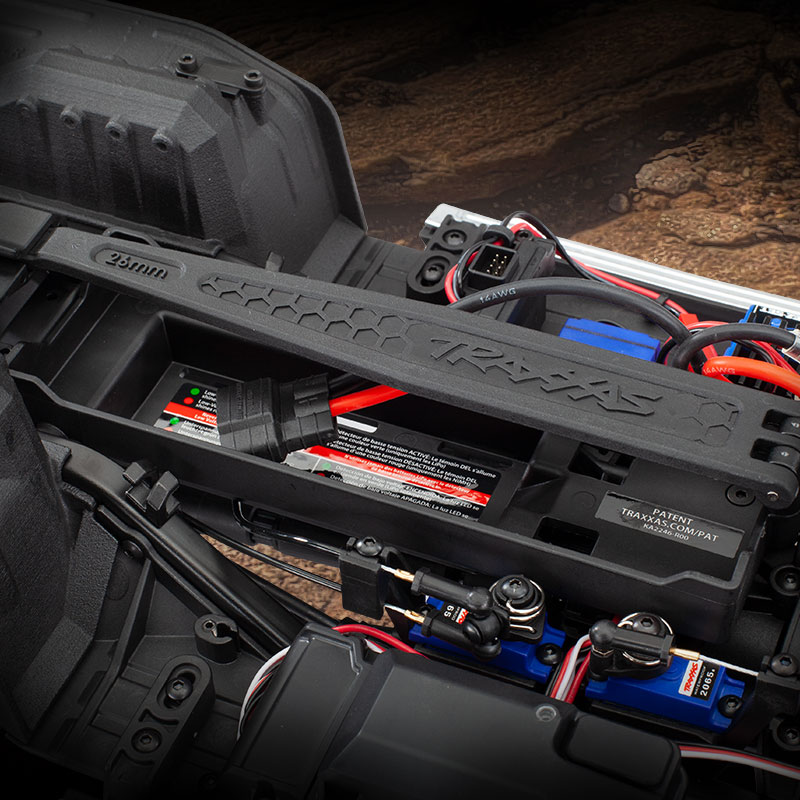 TRX-6 pozwala na stosowanie zarówno pakietów LiPo o pełnej długości jak i mniejszych - stosowanych w skali 1/16. Odchylany element zapewnia szybki i bezpieczny montaż pakietów w terenie. Odchylany element można odwrócić w celu dostosowania do akumulatorów o różnej wysokości. Dodatkowa półka montowana z przodu pozwala przy pakietach w skali 1/16 ustawienie ciężaru bezpośrednio nad przednią osią, aby zapewnić maksymalną przyczepność podczas wspinaczki w stromym terenie.