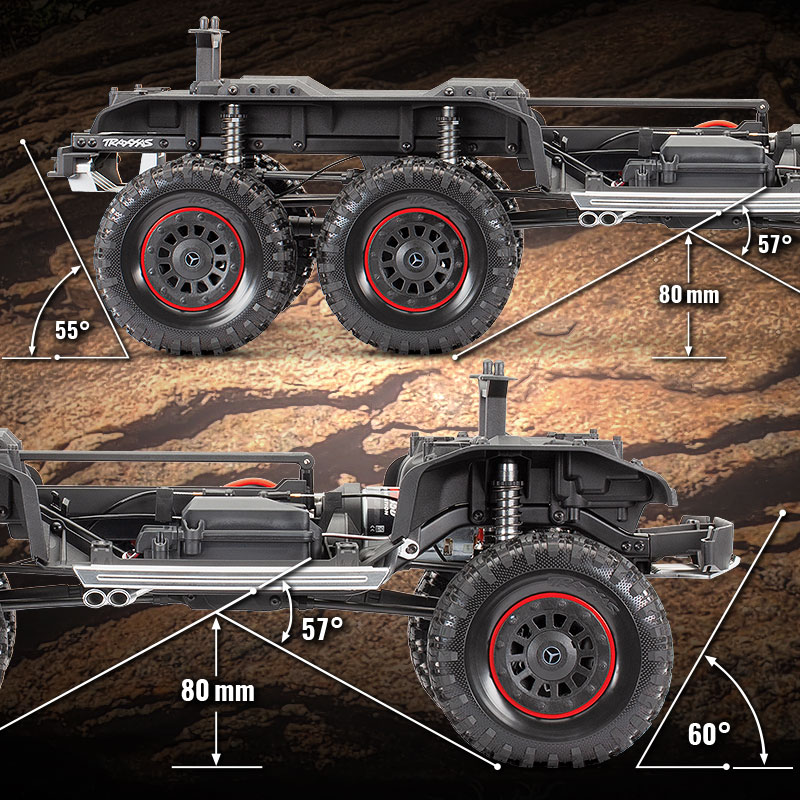 Fabrycznie ustawiony kąt natarcia wynoszący 60 stopni pozwala TRX-6 na wspinanie się po ścianach. Równie imponujący kąt zejścia 55 stopni zapewnia ekstremalne możliwości jazdy nawet w najgłębszych koleinach.