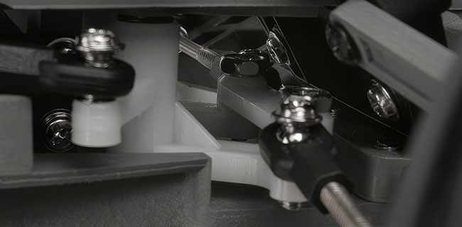 Ciężarówka stadionowa osiągająca prędkość ponad 65km/h potrzebuje zaawansowanego układu kierowniczego, który zapewni ostre jak brzytwa prowadzenie i precyzyjną reakcję układu kierowniczego. Wysokowydajny układ kierowniczy Bellcrank firmy Rustler minimalizuje przechyły, zwiększając stabilność na zakrętach.