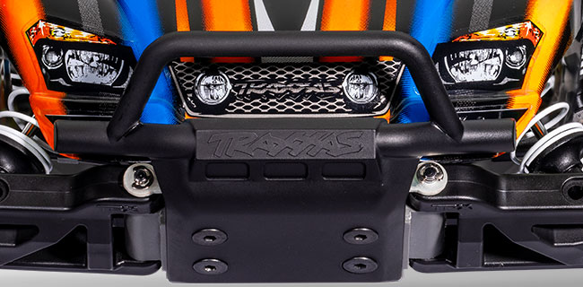 Wytrzymały, rurowy zderzak przedni Rustlera pomaga chronić podwozie przed uszkodzeniami spowodowanymi kolizją. Zderzak posiada również otwory do montażu dodatkowych świateł LED, (części #3791 i #2263 sprzedawane osobno).