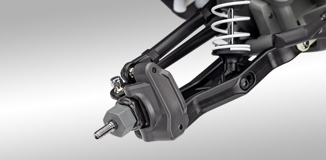 Rustler jest wyposażony w fabrycznie montowane komponenty zawieszenia Extreme Heavy Duty zapewniające najwyższą wytrzymałość i trwałość. Wsporniki tylnej osi, piasty C i bloki kierownicze zostały wzmocnione większą ilością materiału i mocniejszą konstrukcją.