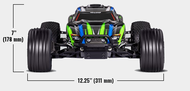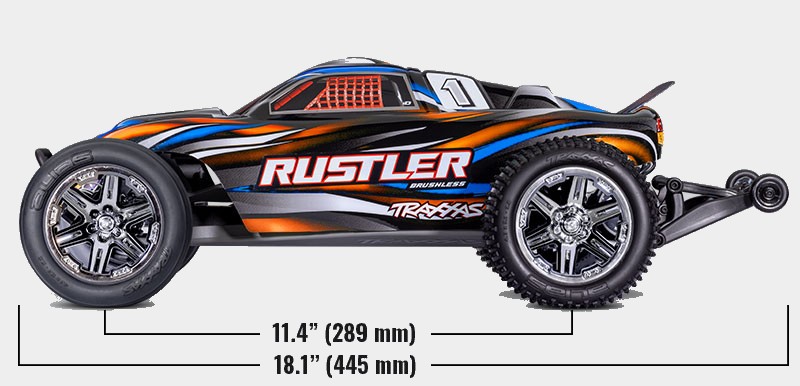 Rustler® jest osadzony nisko i szeroko, aby zapewnić maksymalną stabilność, a lekkie podwozie zapewnia zwinne prowadzenie niespotykane w innych ciężarówkach. Dzięki nowemu bezszczotkowemu systemowi zasilania BL-2s™ Rustler dominuje na polnych torach i rozrywa asfalt z zawrotną prędkością maksymalną ponad 64km/h. Rustler zapewnia zabawę na pełnym gazie w pakiecie Ready-to-Race®, który został wzmocniony komponentami Traxxas Extreme Heavy Duty, aby znieść maksymalne przeciążenia.