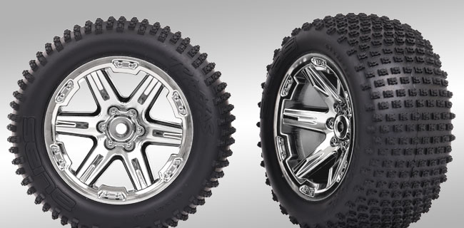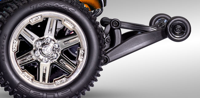 Rustler jeździ na agresywnych 6-ramiennych chromowanych kołach 2,8″. Tylne opony Alias z kołkami stopniowanymi i żebrowane opony przednie utrzymują Rustlera mocno osadzonego w ekstremalnym terenie..