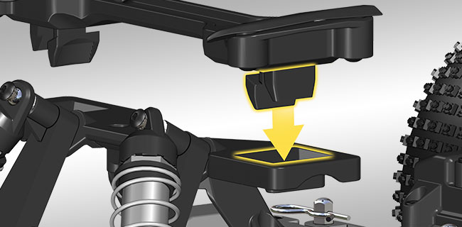 Innowacyjna karoseria Rustlera charakteryzuje się bezpiecznym montażem oraz szybkim i łatwym demontażem. Bez słupków, bez klipsów - po prostu upuść nadwozie na podwozie i zatrzaśnij je na miejscu, aby zapewnić bezpieczne mocowanie. Gdy nadejdzie czas na wymianę akumulatora, wciśnij zaczepy pod nadkolami i podnieś, aby uzyskać dostęp do podwozia w zaledwie kilka sekund.