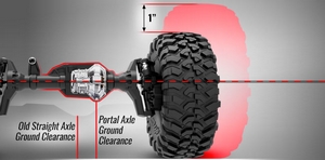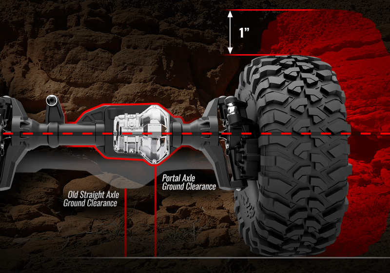 Osie portalowe podnoszą samochód, zapewniając ogromny prześwit w środkowej części nadwozia. Aby uzyskać taki sam prześwit przy zastosowaniu osi prostych, opony musiałyby być o ponad cal wyższe niż opony w modelu TRX-4 Pathfinder.