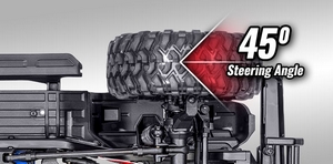 Dzięki kątowi natarcia wynoszącemu 57,93° z przodu, TRX-4 jest gotowy do pokonywania ścian. Równie imponujący kąt zejścia wynoszący 46,50° zapewnia ekstremalne możliwości, nawet w najgłębszych koleinach.