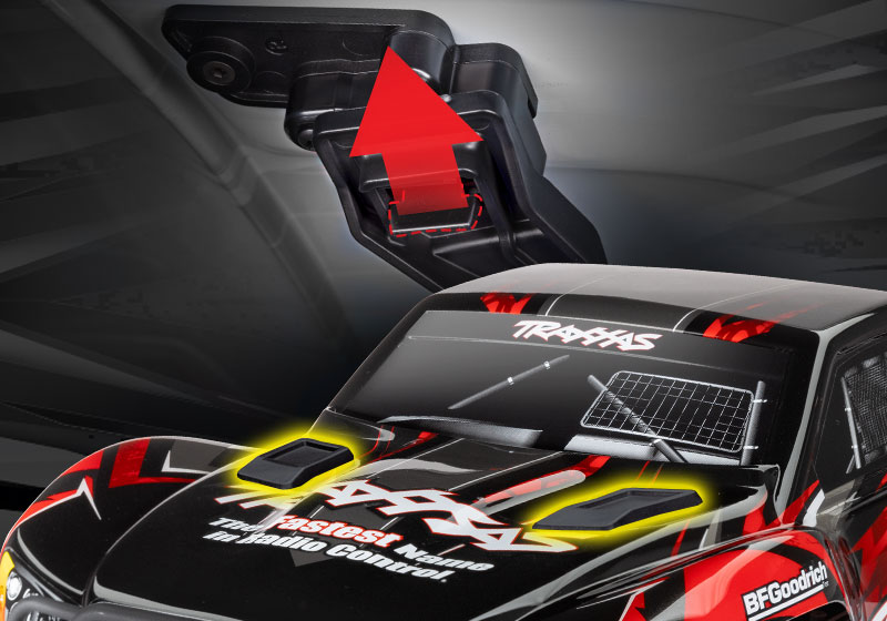 Bezkompromisowa karoseria Slash VXL trzyma się mocno bez względu na to, jak ostre są wyścigi. Wytrzymałe zatrzaski mocno trzymają karoserię, ale zwalniają się w ciągu kilku sekund, umożliwiając szybką wymianę baterii w pit-stopie. Ten wygodny, ukryty system zatrzasków zastępuje tradycyjne klipsy karoserii dużymi, wzmocnionymi panelami, które utrzymują integralność karoserii i są odporne na uszkodzenia.